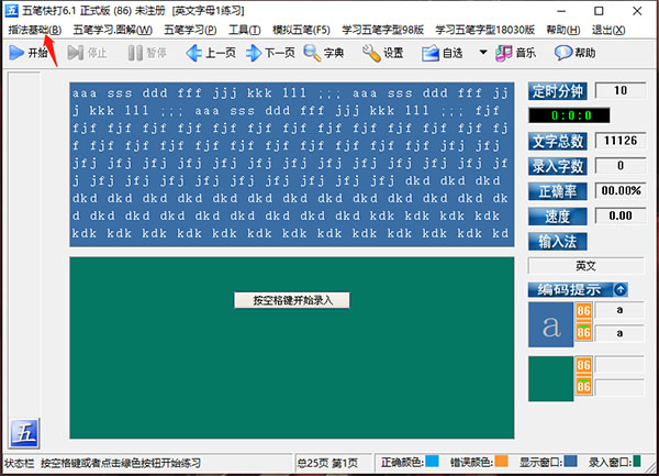 4、提供内容丰富的英文和五笔练习,包括英文指法、全部五笔字根(包括非成字字根)、单字、词组、文章和自选练习;