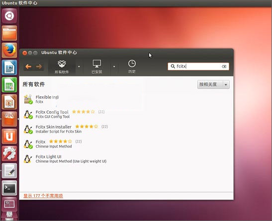 4、打开Ubuntu软件中心,在搜索栏输入fcitx,将会搜出fcitx,然后按照一般软件安装步骤安装即可完成升级。
