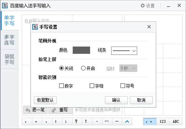 6、在设置里我们可以进行笔画外观、抬笔上屏以及智能识别数字字母符号的设置