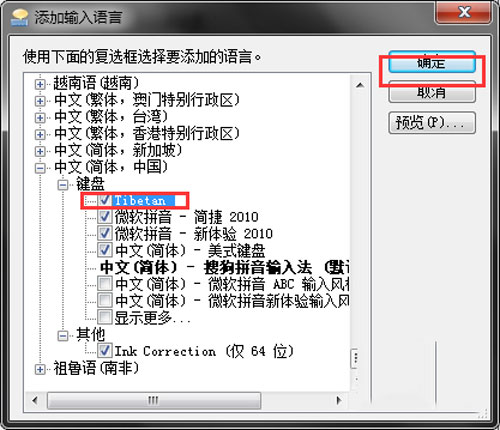 3、勾选Tibetan,点击确定保存即可