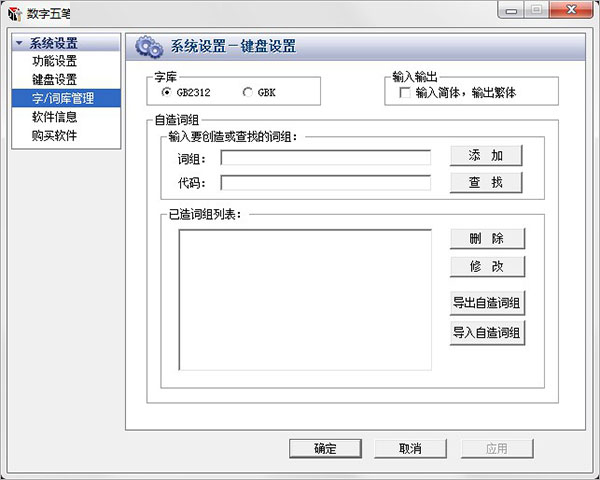 4、自造词组:根据自己的需要输入词组,代码可以自定义也可以自动生成,点击添加即可增加自造词组;也可以查找、和删除修改;同时可以自行导出和导入自造词组。