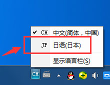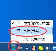 2、点击“CH”选项选项后我们可以看到弹出三个选项,中文、日语、显示语言栏三个选项,我们点击“JP 日语(日本)”;