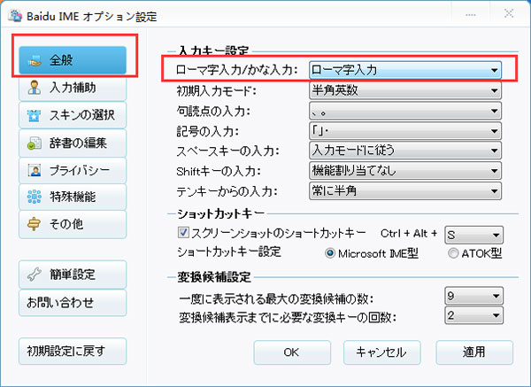 3、接下来我们进入オプション设定界面,如下图所示,这个界面有很多的设置选项,我们找到“ローマ字入力/かな入力”,并将其修改成“ローマ字入力”就行了,这样你就成功的将百度日语输入法改成罗马音输入了。