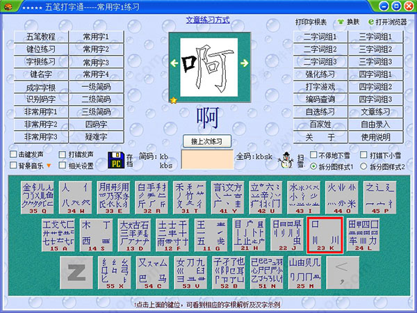 软件里还有打字游戏,比如汉字、数字和符号练习,这些设计得很有趣,完全不觉得枯燥。另外,它还能查五笔编码和拆码图,这个功能对我这种刚开始学的人帮助很大,特别是有时候记不住怎么拆分汉字的时候,有这个功能真的方便很多。