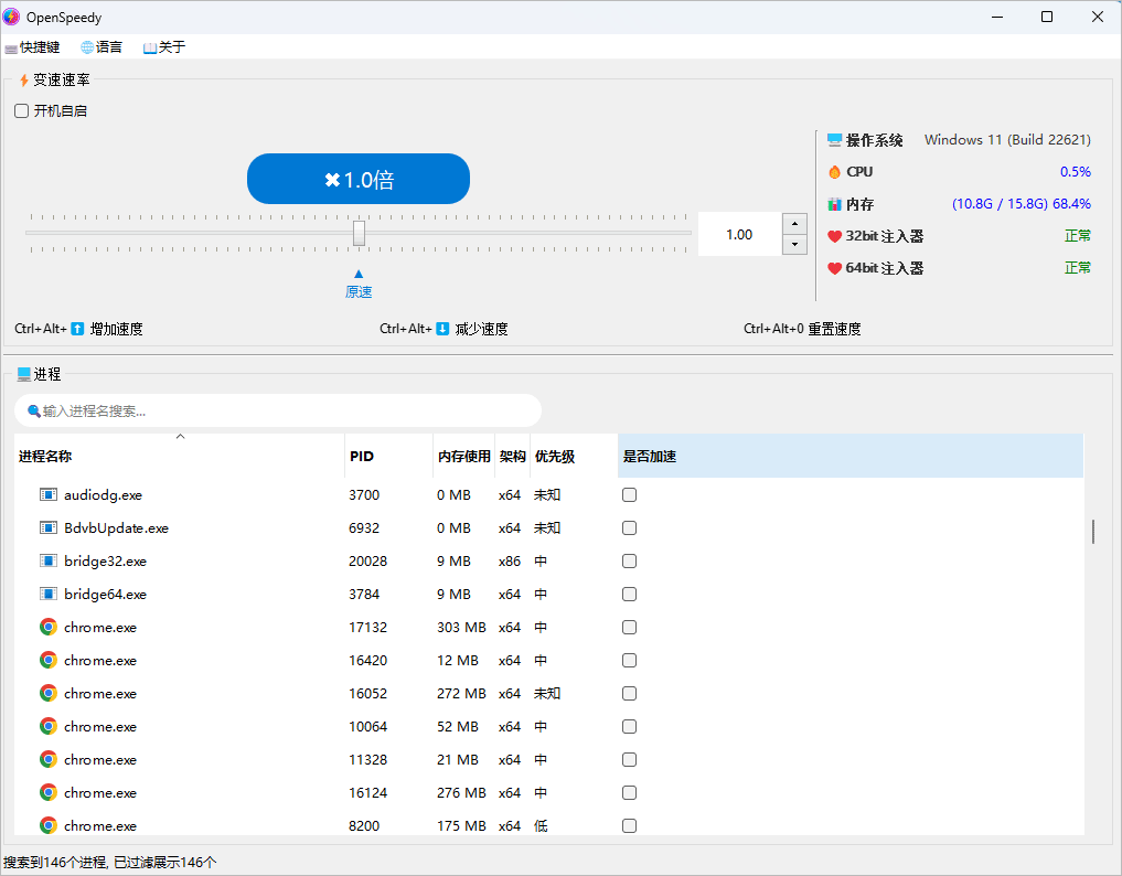 3、选择游戏进程,在 OpenSpeedy 界面调整速度倍数