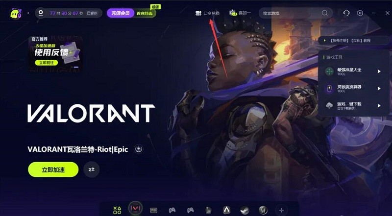 第一步:启动【古怪加速器】客户端,登录后,在客户端界面上方点击【口令兑换】按钮,进入口令兑换页面。