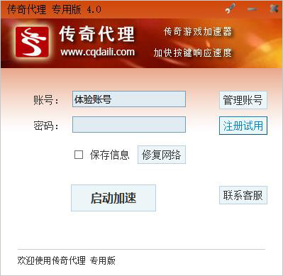 启动加速:默认的体验帐号已填好,点[启动加速]按钮即可;