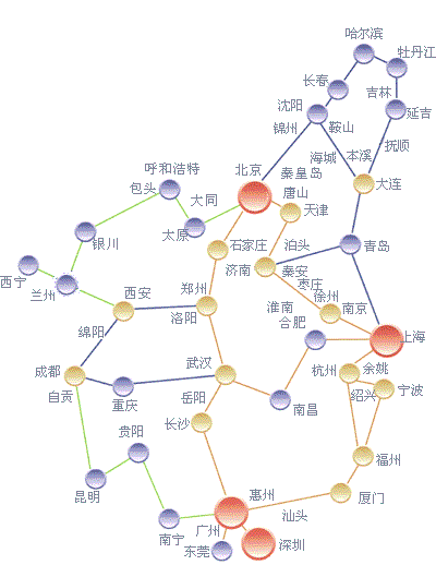 中国联通:北京、上海、浙江、广东、天津、山东、河北、河南等城市的骨干节点;