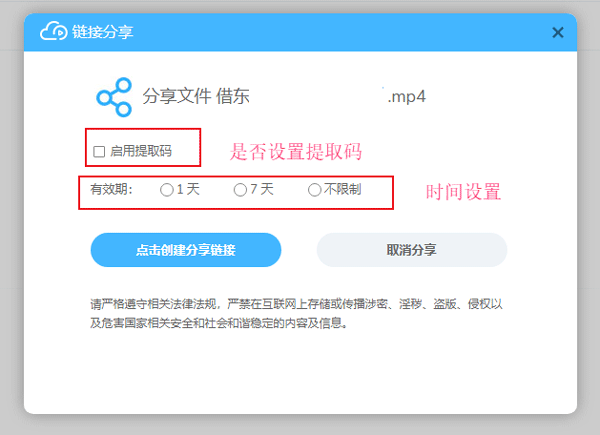 在弹出的窗口中可选择设置提取码以及链接的有效时间