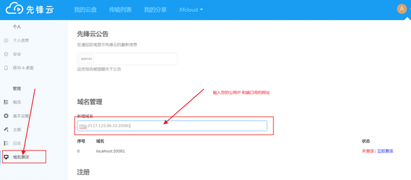 域名管理栏新增域名或公网IP,域名列表的对应状态栏,点击“立即激活”按钮激活和绑定(只有公网IP、正常解析到计算机的域名才能被激活)。