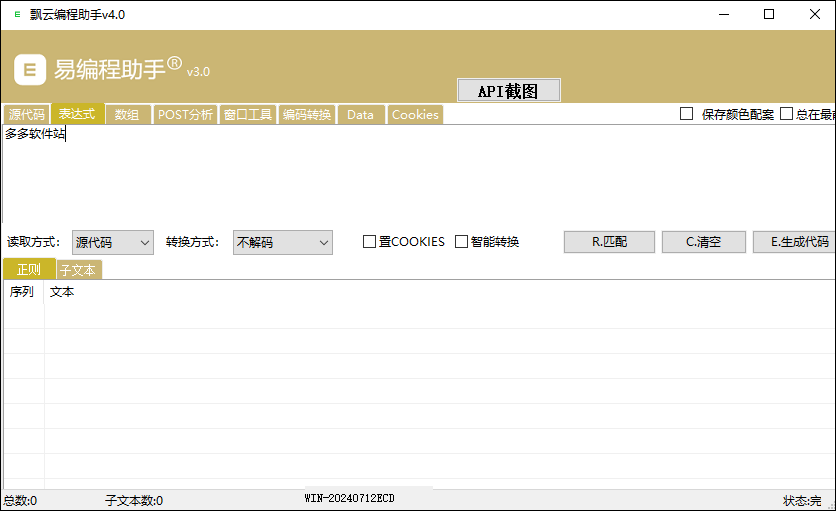 以分割前后文本的形式匹配,可调用源代码、URL两种数据来源,可进行编码解码数据生成编程代码。