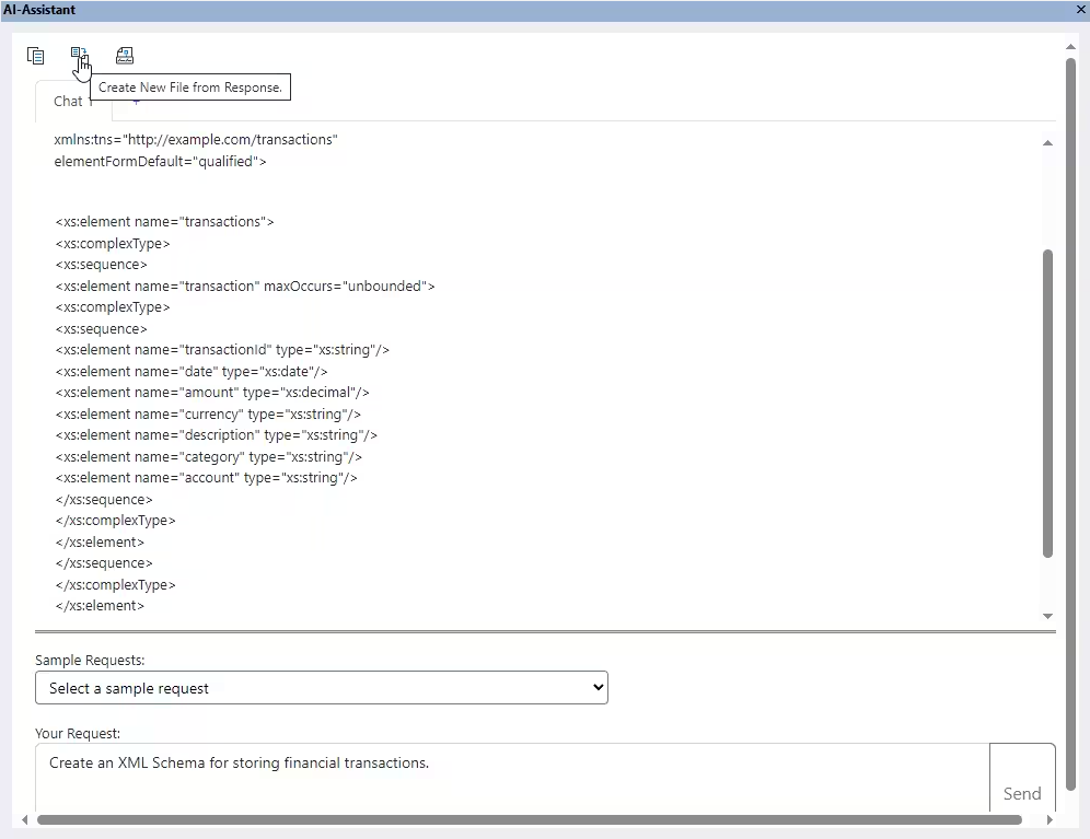 ChatGPT 直接在 XMLSpy 中自动生成与您的提示相对应的代码,这可以大大加快开发过程。使用 AI Assistant 工具栏,您可以将响应复制到剪贴板、创建包含响应的新文档,或在 XMLSpy XPath/XQuery 窗口中打开它。