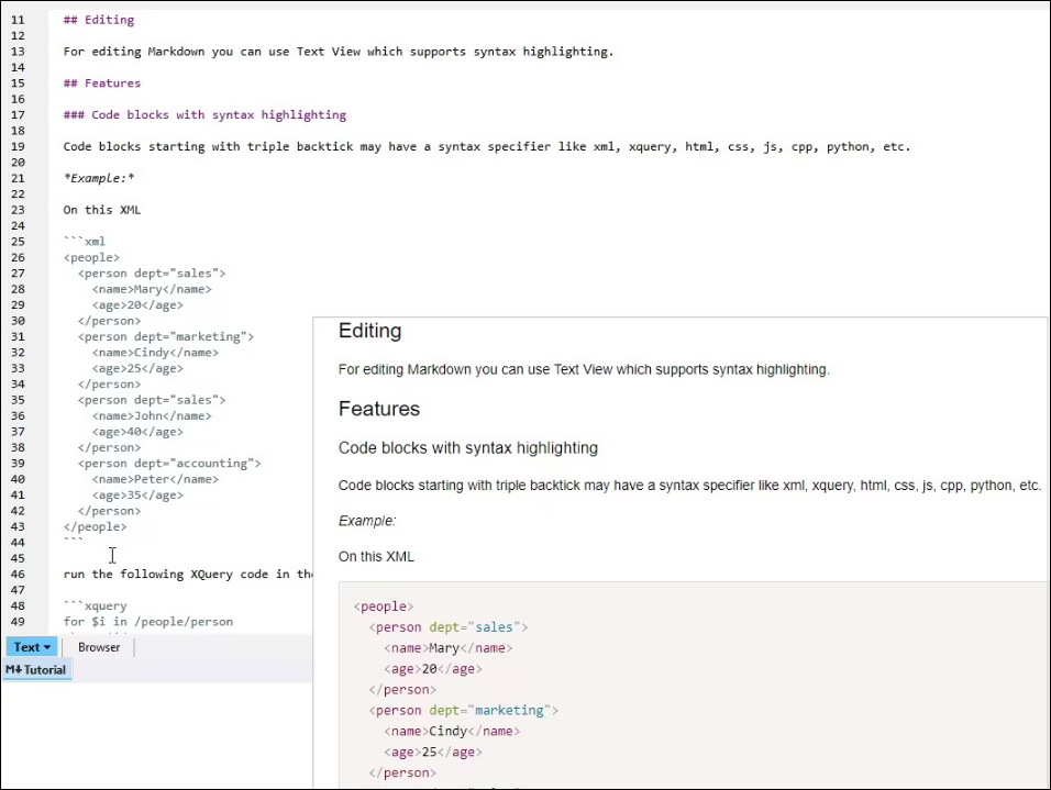 XMLSpy 支持在浏览器视图中查看渲染的 Markdown (.md) 文件,并在文本视图中使用语法着色对其进行编辑。版本 2024 附带了示例 Markdown 文档和教程,用于快速开始使用 Markdown 语法,添加粗体和斜体等格式元素以及基于指定语言(例如 XML、JSON、Python、HTML)自动语法着色的代码块, ETC。