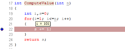 点击工具栏上的“调试”按钮,程序在断点处停止,我们将鼠标移到变量i处,显示“i=101”,如下图所示。将鼠标移到变量s处,显示“s=5050”。