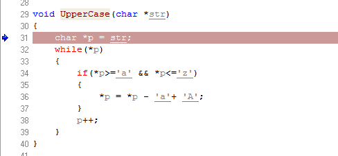 单击“进入”按钮,程序进入UpperCase函数,如下图所示: