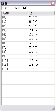 例如,对于对于图11的局部变量,双击“szMyStr”,由于szMyStr是字符串数组,因此将显示“察看”窗口,如下图所示:
