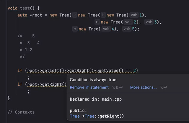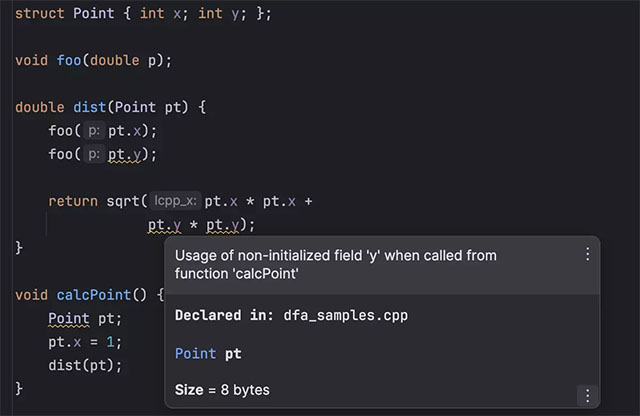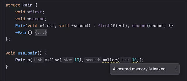 CLion 提供了一个内置数据流分析器,这个分析器会在您编写代码时持续运行并帮助提高代码质量。 在 v2023.3 中,我们改进了整体分析的准确性和性能,并添加了内存泄漏分析。