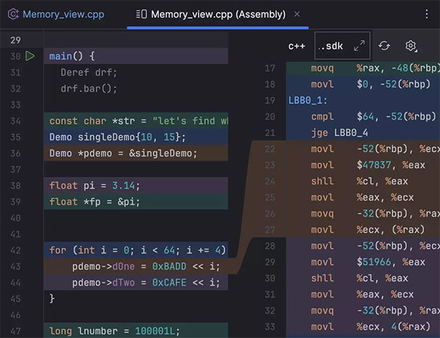在 CLion 2023.3 中,您不需要调试会话来探索底层程序集代码! 新的 Show Assembly(显示程序集)操作使用当前所选解析配置中的编译器设置,将当前查看的 C/C++ 文件的代码编译为程序集,并打开一个编辑器,其中的预览会显示哪个源代码生成哪个程序集。