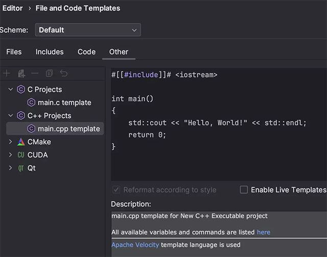 通过 CLion 中的 New Project(新建项目)向导创建新项目时,main.cpp 或 main.c 文件将自动生成 。 但在某些情况下,您可能希望依赖于这些文件的自定义模板。 在 CLion 2023.3 中,您可以在 Settings/Preferences | Editor | File and Code Templates | Other(设置/偏好设置 | 编辑器 | 文件和代码模板 | 其他)中编辑此类模板。