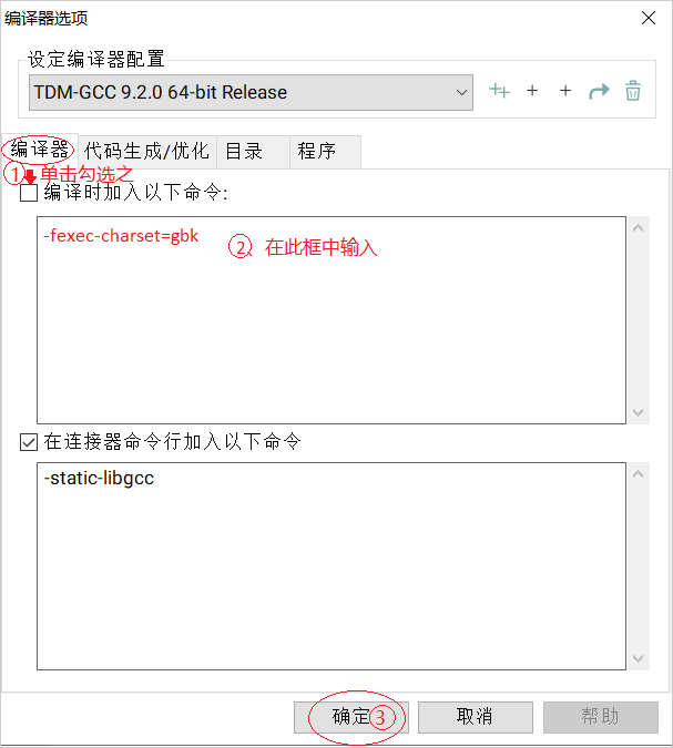 使用菜单命令“工具→编译选项”出现如下对话换框,参见下图操作,勾选“编译器加入以下命令”,并在其下面的框中填入