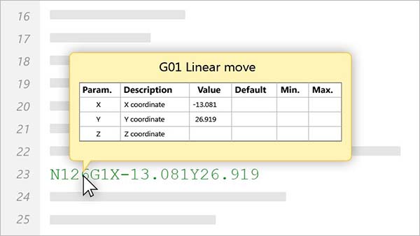 指向任何M代码或G代码,NC助手将识别该代码,并允许您通过与CNC代码链接的交互界面修改其值。输入所需的值,代码将自动更新。