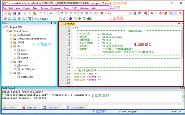 打开新建好的工程,进入的界面大概包含如下“主界面”几大块。工具栏、编辑窗口和状态栏可以关闭,工程窗口和信息窗口可以可以隐藏和关闭。