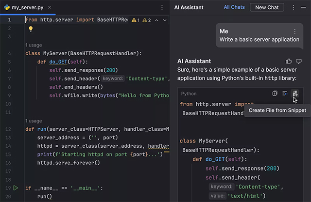 这项新的 AI Assistant 功能将加快从试验查询到实现实际代码的速度。 现在,JetBrains AI Assistant 生成的每个代码段顶部都会出现一个新的 Create a file(创建文件)按钮。 点击该按钮后,PyCharm 会自动以正确扩展名创建文件并填入代码