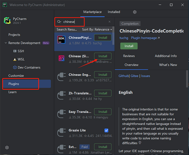 1、进入软件后,首先点击下方插件,然后在搜索栏输入Chinese,最后点击下载即可