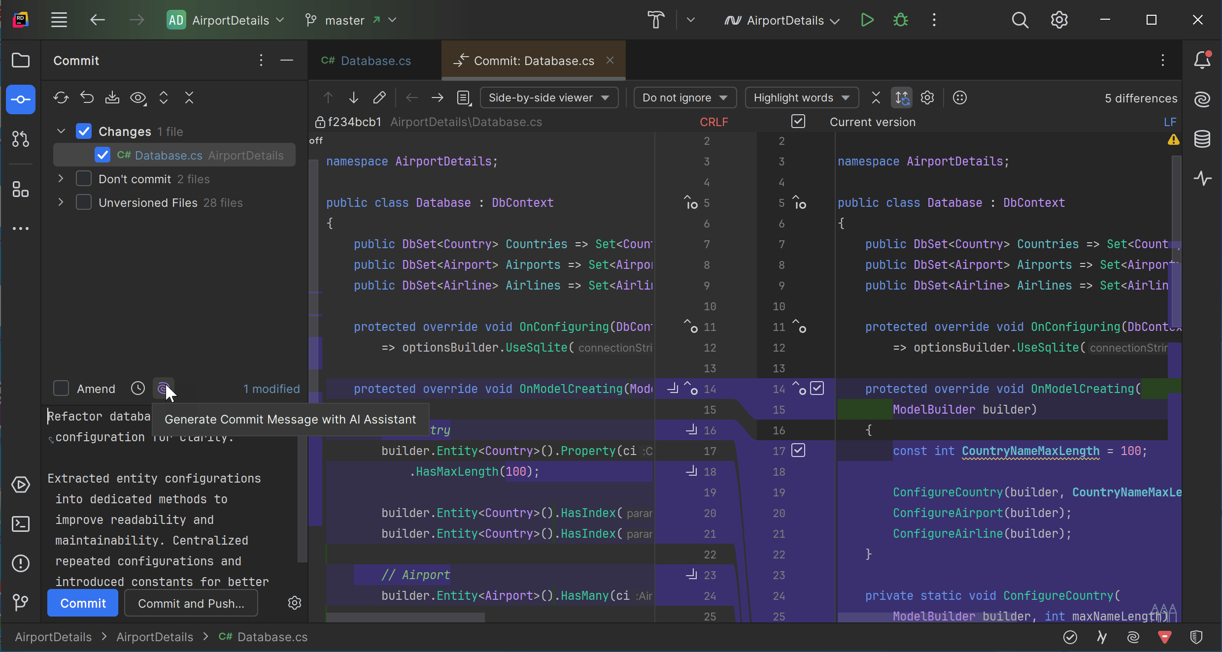 Rider 包括对 Git、Subversion、Mercurial、Perforce 和 TFS 的开箱即用支持,并通过插件支持更多版本控制系统。在代码编辑器中,本地更改会在您键入时突出显示。使用专用的 VCS 工具窗口,您可以查看本地、传入和存储库更改、管理更改列表、搁置更改以供以后使用、查看差异、提交和推送。内置的可视化合并工具将帮助您解决冲突,Rider 甚至会让您知道您正在处理的文件在上次更新后是否已更改。