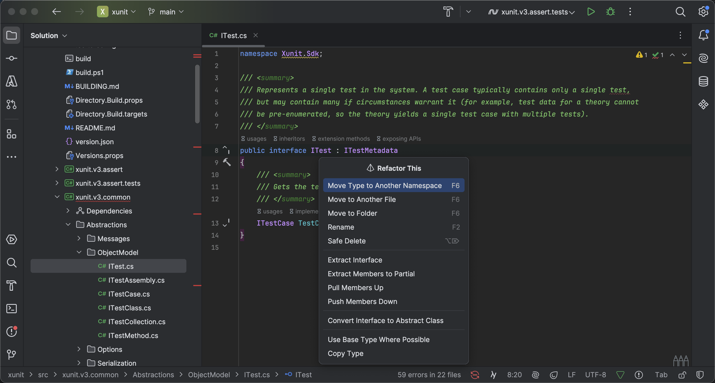 - 包含 60 多个重构操作,如重命名、提取方法、接口化等。