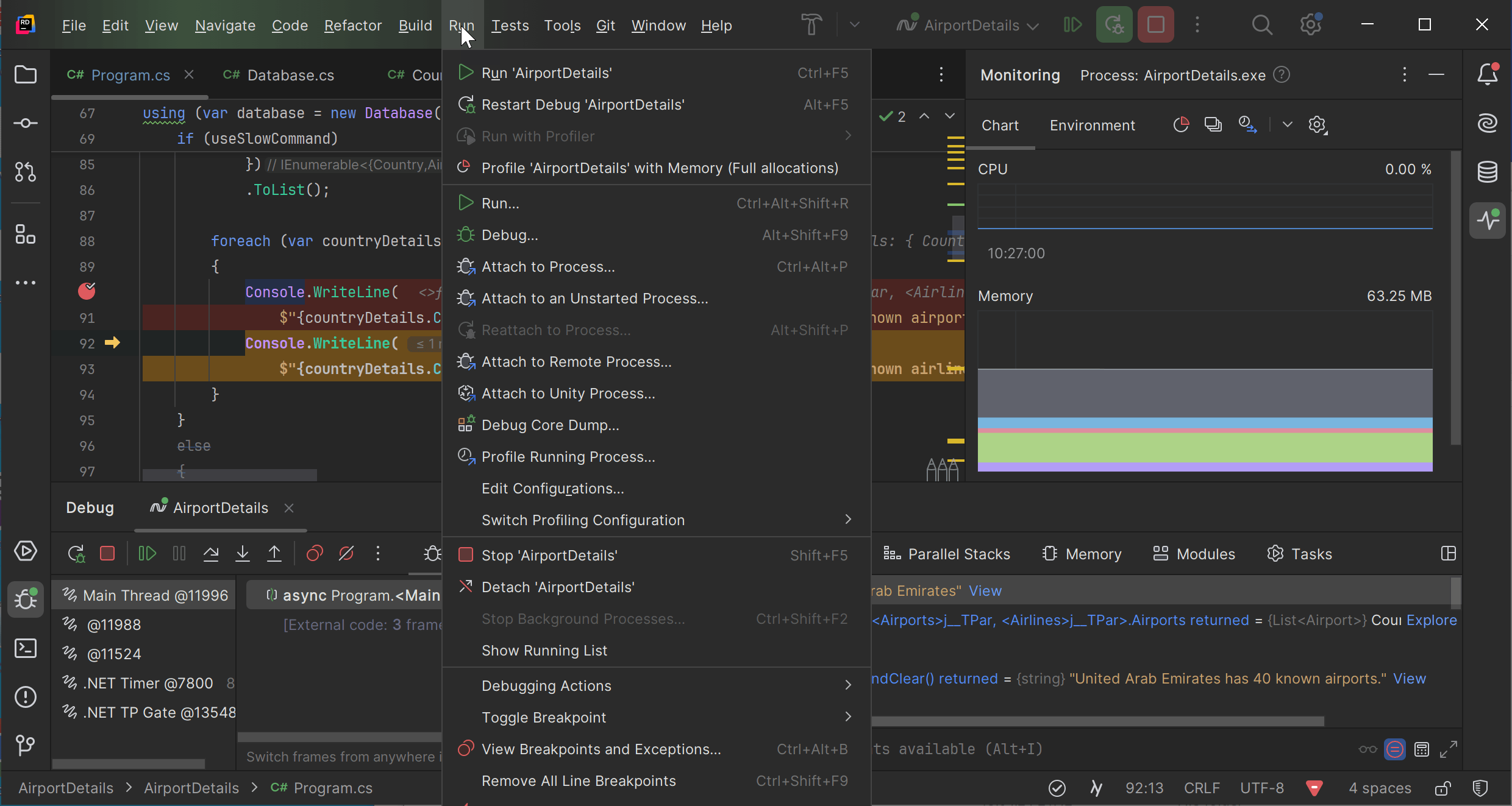 Rider 2024.3 引入了在调试期间冻结和解冻个别线程的功能,可以对多线程应用程序进行更精确的控制。 利用这此功能,右键点击任意线程并选择 Freeze(冻结)即可暂停执行该线程,而不会影响应用程序的其余部分。 准备好后,再次点击右键并选择 Unfreeze(解冻)即可恢复执行该线程。 该功能仅适用于面向 .NET 和 .NET Framework 的项目。