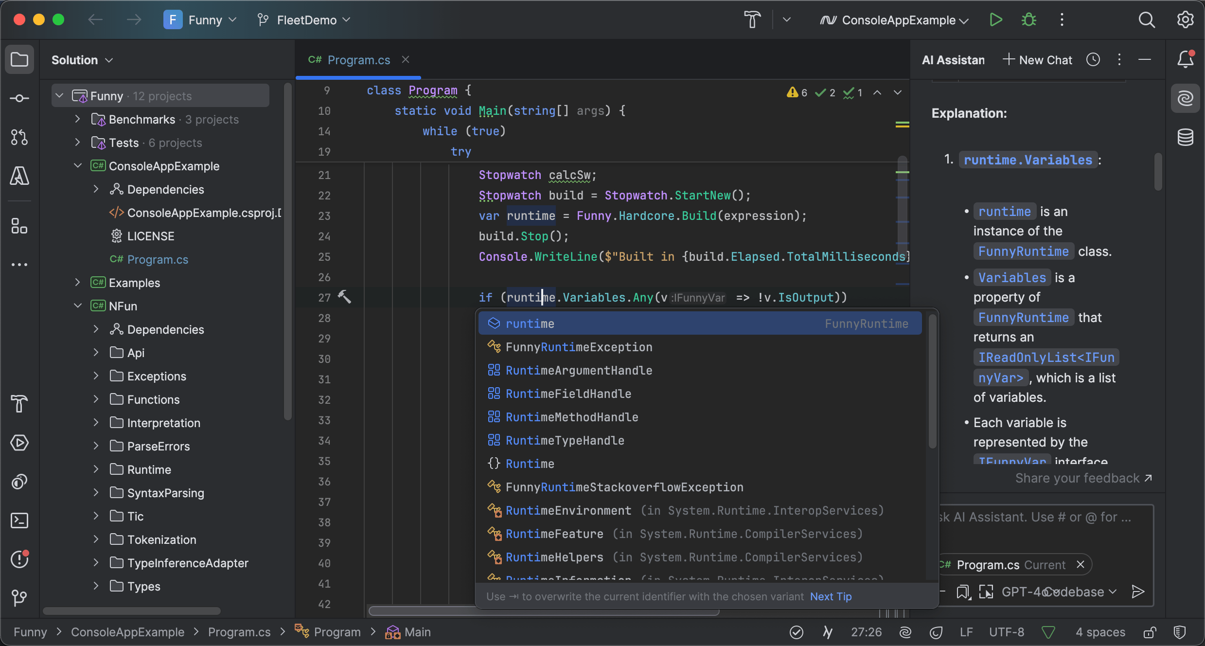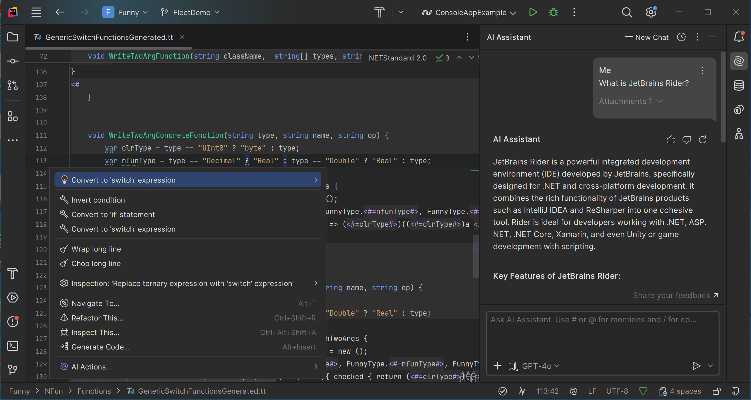 Rider2024官方版是基于IntelliJ和ReSharper开发的一款跨平台集成开发环境,专为C#、Unity和其他.NET应用程序开发而设计,同时具有强大的代码编辑器,支持多种编程语言和框架。无论是C#、Unity还是ASP.NET,开发人员都可以轻松地在Rider中编写代码,编辑器还提供了智能代码补全功能,可以根据上下文自动推荐代码片段,大大提高了开发人员的编码速度和准确性。