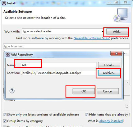 启动 Eclipse,选择 Help > Install New Software,在出现的对话框里,点击Add按钮,在对话框的name一栏输入“ADT”, 然后点击Archive...,浏览和选择已经下载的ADT插件压缩文件。