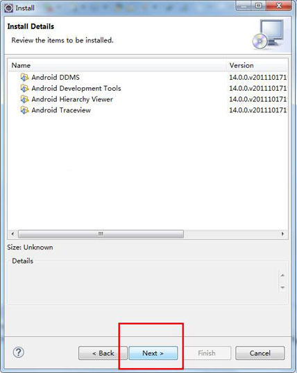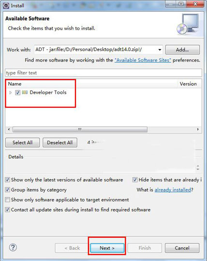 3.点击 OK.。返回可用软件的视图,你会看到这个插件,然后选择Developer Tools (会选中下面的“Android Developer Tools”和 “Android Editors“),点击 Next,最后重启 Eclipse