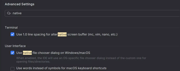 IntelliJ IDEA 现在默认使用原生 Windows 文件对话框而不是 IDE 的自定义实现。 这能让您在打开或保存文件时获得更熟悉的体验。 如果您更喜欢此前的行为,可以在 Advanced Settings | User Interface(高级设置 | 用户界面)中进行恢复。