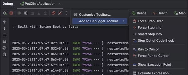 现在,您可以自定义调试器的工具栏以更好地搭配您的工作流,充分利用其强大功能。 在顶部窗格三点菜单的旁边点击右键,选择 Add to Debugger Toolbar(添加到调试器工具栏),以查看可用操作列表。