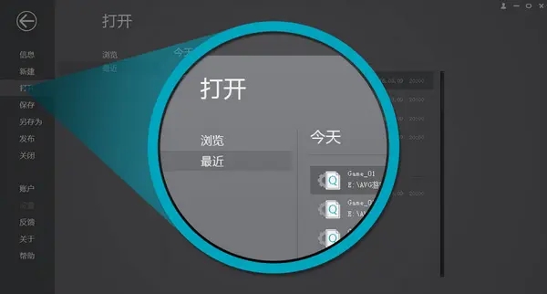 进入“文件”菜单上,单击“打开”(也可单击快速启动栏的“打开”),您将在右列中看到最近使用的游戏工程文档列表。如果您查找的游戏工程文档不在其中,请单击“浏览”,选择您之前保存过的游戏工程文件。