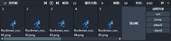 Lakeshore 提供了丰富的常用组件,比如动画,九宫格,瓦片地图,位图字体,数组和函数等。利用这些组件可以十分方便的实现游戏中的特殊功能。例如,动画可以十分便利 直观的给游戏中添加序列帧动画。对于略懂游戏逻辑的用户,数组和函数可以高效快捷的实现复杂的游戏逻辑。序列帧动画面板如下图:
