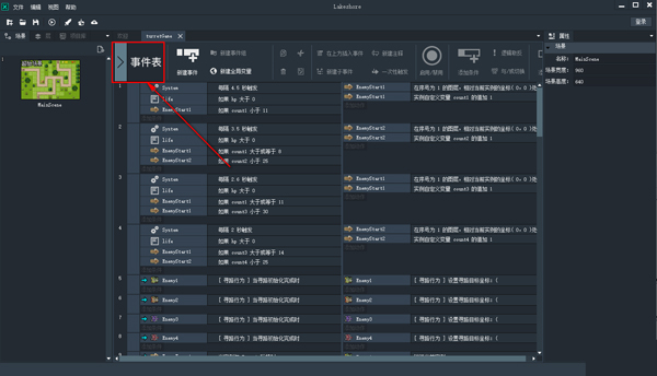 Lakeshore 的游戏逻辑都通过事件表来编辑和呈现。事件表可以清晰的呈现游戏的逻辑关系。事件描述的语句通俗易懂,就算没有开发能力的用户也可以轻松读懂每条事件的功 用和事件间的逻辑关系。事件表中的条件,动作和事件都支持复制,剪切和粘贴,使得逻辑的编辑更加便捷。同时事件表还支持事件分组,嵌套子事件,条件的 “与”、“或”和“取反”,添加注释等高级功能。事件表界面如下: