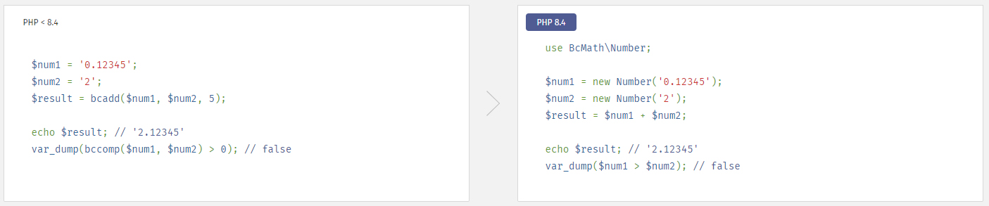 新的 BcMath\Number 对象使在处理任意精度数字时可以使用面向对象的方式和标准的数学运算符。