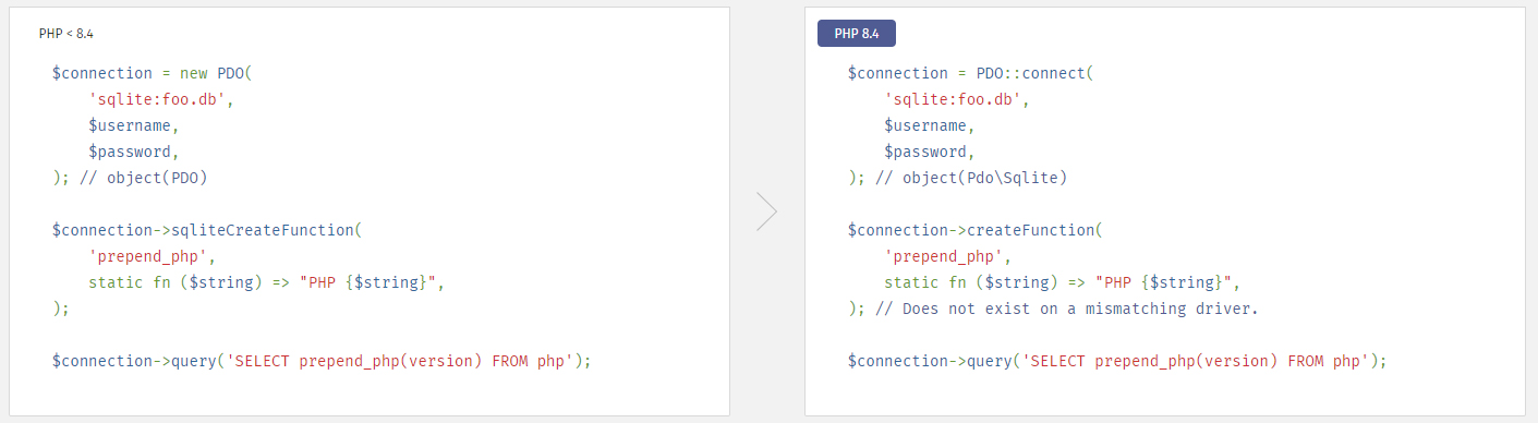 新的 Pdo\Dblib、Pdo\Firebird、Pdo\MySql、Pdo\Odbc、Pdo\Pgsql 和 Pdo\Sqlite 的子类可用。
