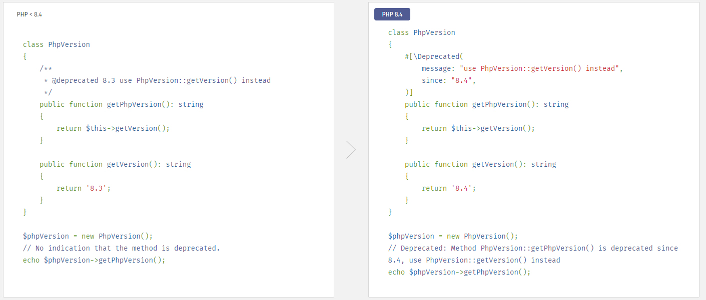 新的 #[\Deprecated] 属性使 PHP 的现有弃用机制可用于用户定义的函数、方法和类常量。