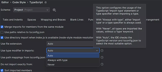 PhpStorm 包含 WebStorm 功能,现在解决了添加语句时出现的一些令人沮丧的不一致问题import type,并且使使用变得verbatimModuleSyntax更加容易。我们添加了用于配置 TypeScript 导入类型语句类型的选项。我们还改进了 TypeScript 文件的package.jsonexports字段的行为。