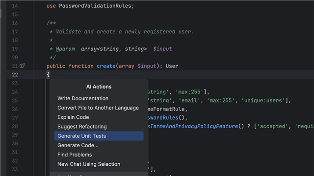 AI Assistant 还可以为类方法生成测试。将插入符号放在您希望用单元测试覆盖的类方法上,只需按Alt+Enter,选择 AI Assistant,然后选择“生成单元测试”。