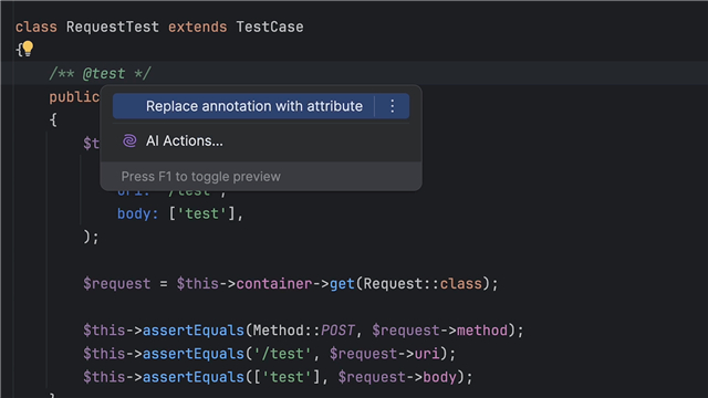 随着 PHP 8.0 中引入属性,Doctrine 注释已被弃用,并将很快被删除。为了帮助您进行切换,PhpStorm 2023.3 包含将 Doctrine 注释转换为属性的功能。