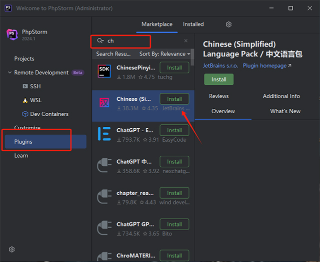 1、进入软件之后,首先选择下方插件选项,然后在搜索栏输入Chinese,最后点击下载