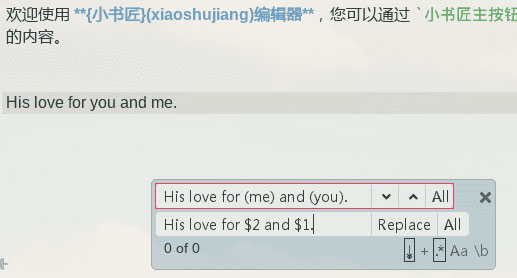 比如想要将语句His love for me and you.实现将 you 和 me 进行对调,只需要输入这样的查找语句His love for (me) and (you)。然后在替换区域输入这样的语句His love for $2 and $1.,就可以了