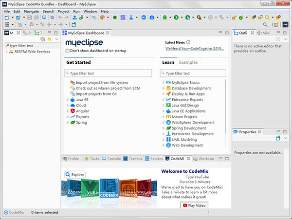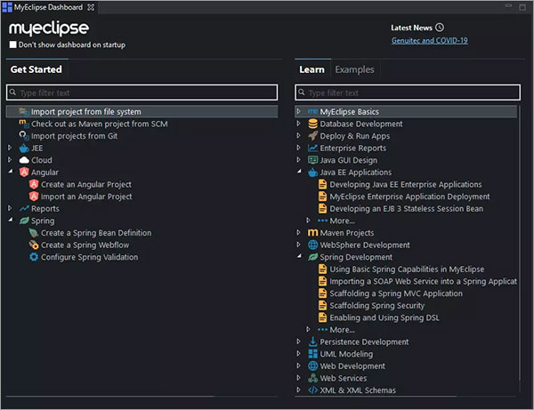此新版本的 MyEclipse 中立即可见,即我们刷新和简化的仪表板。我们删除了未使用的页面,仪表板现在是一个重点突出的选项卡,包含向导、文档和示例集合的可搜索列表。