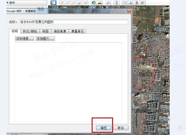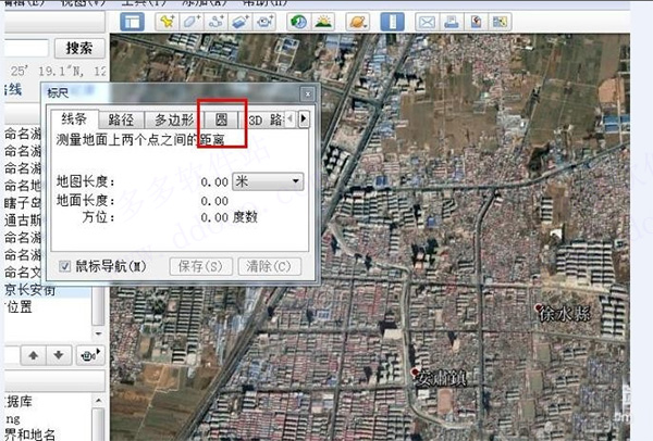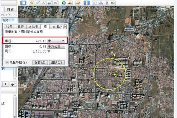 4、将半径调整为米。这时地球上的鼠标会变成带有十字线的框框,将十字线的中心对准选择的点,点击一下左键,拉开就会出现一个圆形,这时窗口里的半径就会有长度显示。拉到我们需要的长度为止,比如我们现在要求的是500米。