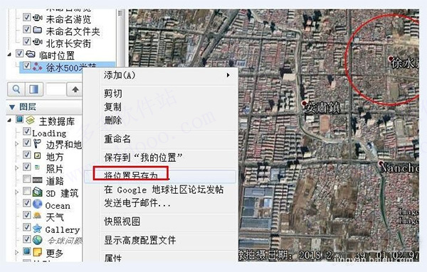 6、这时在地球的左侧栏就会出现我们保存的文件名字。左键单击保存的文件,在下拉菜单中选择“将位置另存为”。在出现本地的文件中点击“保存”